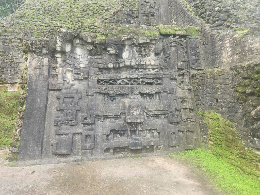 The northernmost uncovered structure at Lamanai was a smaller pyramid, but it had two giant faces carved into each side of the main stairway, each taller than Delaney or I! We overheard a nearby tour guide explaining how they were discovered- the Mayans, over successive generations, would build new pyramids right on top of the old ones, covering up all sorts of carvings and stucco sculptures. It has preserved many things that would have otherwise decayed in the wet climate. However, once the faces were uncovered, they are once again subject to decay, so the real faces were removed, and the ones here are replicas! They were very convincing replicas, and the tour guide knocked his finger on them to show how they were made out of fiberglass and plaster. In the other Mayan sites we’ve been to, we’ve found that quite a few of the carvings and stelae are fiberglass replicas. The replicas are very good but I wish that they would keep the real ones on site- most are in museums in the larger cities, or taken abroad by the early archeologists.