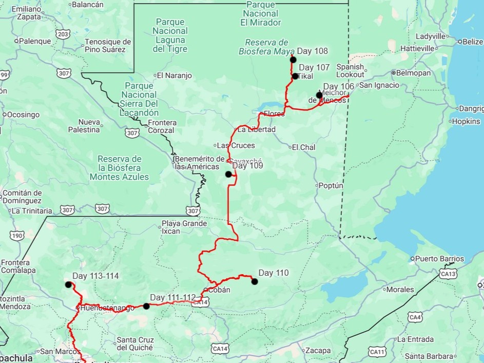 After about an hour and a half after we’d arrived at the Belize side of the border, we were into Guatemala! We restocked on food in the busy town of Melchor de Mencos, but we struggled a bit to find an ATM to get some Guatemalan Quetzals, as their currency is called. It is named after the national bird, the Resplendent Quetzal, a spectacular green bird of the humid forests here. We were able to kill two birds with one stone (not quetzals fortunately) as we finally found an ATM where we filled up with gas. Belize’s gas is quite expensive, around $5.50 a gallon, and Guatemala’s is relatively cheaper, at $4 a gallon. We’d managed to avoid buying any gas at all in Belize, thanks to our fantastic fuel range.