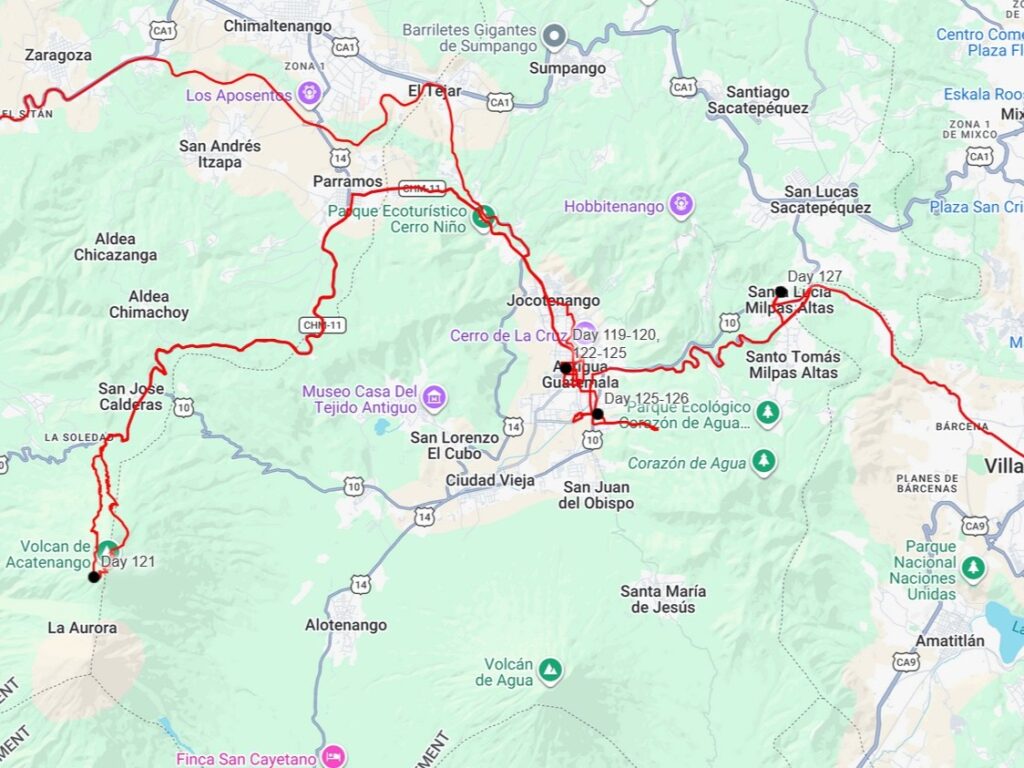 After two relaxing nights in Panajachel, it was finally time for us to meet Brooke and Kevin in Antigua. We arrived in plenty of time and met our friend from Oaxaca, Tevin, for lunch. He’s been staying in Antigua for the last two weeks as his girlfriend Bri travels back to the states for some work obligations. Lunch was excellent, and afterwards we drove off down the cobblestone streets of Antigua to meet Brooke and Kevin at the AirBNB we’d be staying at for the next week. They met us as we drove up, and it was surreal to see a familiar face for the first time since seeing Scott in Mazatlan! The AirBNB had secure parking for the jeep, which was great peace of mind when it would be out of sight for a few days. The place was lovely- a bedroom and bathroom for each of us, plus a kitchen, patio, and rooftop with views of the surrounding volcanoes. We took some much-needed showers and started the first of many loads of laundry while Brooke and Kevin went out to reacquaint themselves with Antigua. They’d lived here for four months last year while Brooke volunteered at a school as an English teacher. We met them for the first of many dinners out together, before having the best sleep either of us had had in a while back at the apartment. We didn’t really have an agenda for the next day beyond packing for a hike the day after that, so we had a lazy morning before going out to brunch. We wandered around town for most of the day, before returning and packing our things to climb Volcan Acatenango.