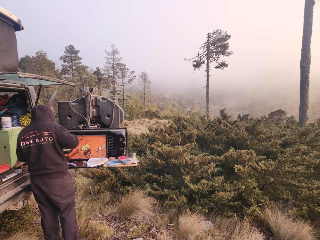 Soon after we laid down in the jeep, the wind picked up and continued all night. We were warm enough, but only just! It dropped below freezing overnight, and we were very glad to have our cold-weather gear with us. We woke up to a thick layer of fog and mist, with the wind still blowing. It was very chilly, but I sure wanted to find the bird, and Delaney is thankfully always up for a hike! We geared up, putting on long underwear, down jackets, and our raingear, before starting off into the wet, foggy, and blustery morning.