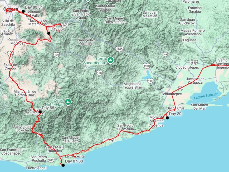The next morning, we saw that the logging road we were on continued and met up with the main highway a bit further south, so we continued on the narrow dirt road. We passed through the village of San Mateo Rio Hondo, with the narrowest and steepest city streets we’d ever seen! It is amazing where some of these towns are built. The whole area was amazing, with giant pine trees and flowering underbrush, all on top of some very rugged and steep mountains. We continued up and down on highway 175, which rivaled any of the super windy roads we’d been on- highway 40 from Mazatlan to Durango, highway 182 in northern Oaxaca, and highway 85 in Hidalgo.