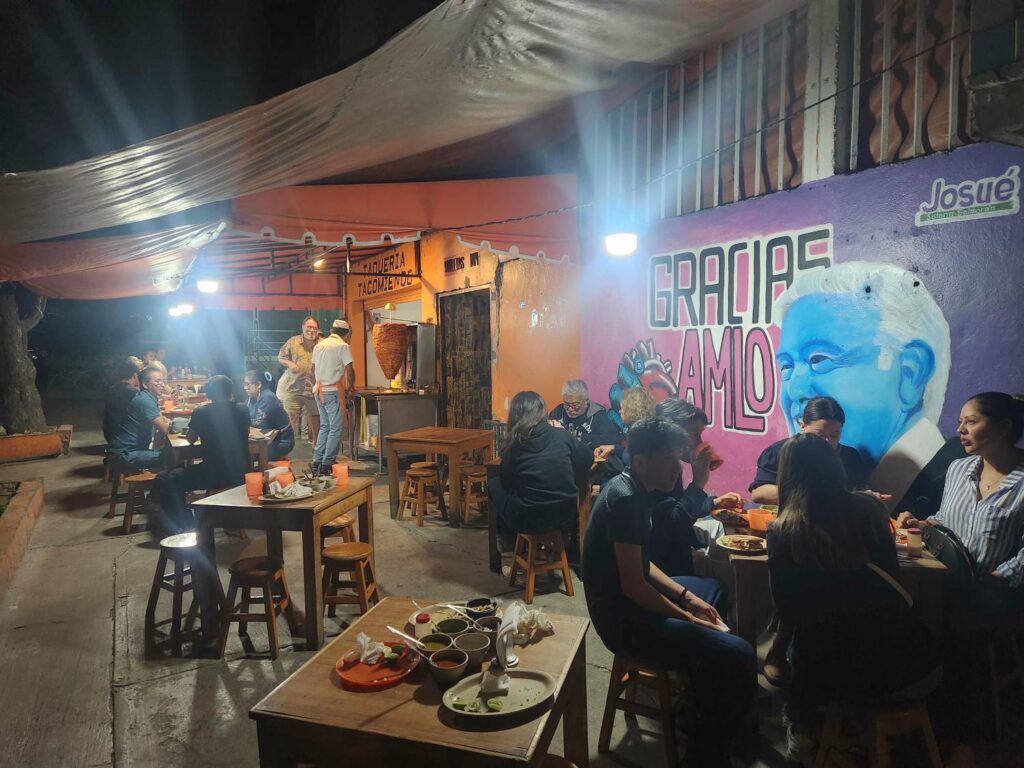 We had planned on camping in the mountains north of the city, but we realized that it was far too late to make it there. Paul suggested visiting a taco place downtown called Tacomiendo that he had visited 20 years before, and claimed that they were the best tacos he’d ever had. It would mean staying at OaxacaView another night and driving back in the dark, but of all the places we’d been so far in Mexico, Oaxaca felt the safest, and we decided to go for it. We found the “back way” down the mountain into town, which had a lot more traffic but was far easier for Paul and Kerry and their RV. We made our way into the center of town and parked right near the taco spot.