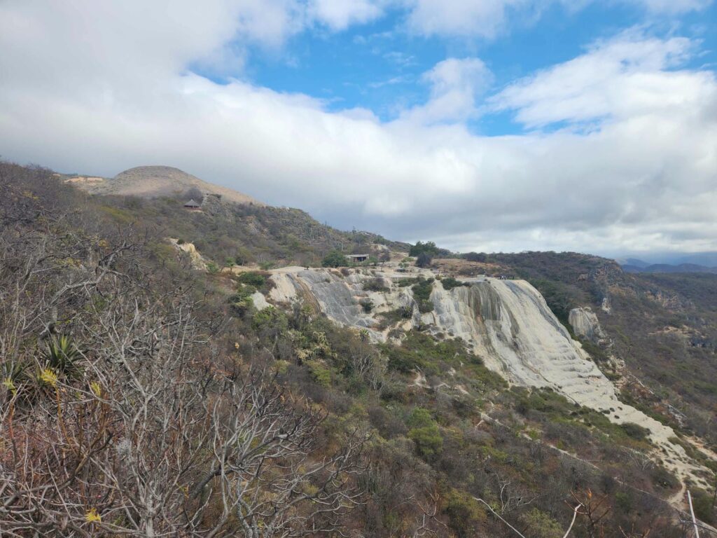 We spent a very windy night in the mezcal place’s parking lot, and headed further east the next morning to Hierve el Agua. We drove in the back way, up a windy and switchbacked road, before descending down towards the entrance gate. Hierve el Agua is arguably Oaxaca’s best known tourist destination. It looks like a hot spring, but is a “cold spring” with lots of dissolved minerals in it, which precipitate out on the surface, forming some incredible deposits. It is often called a frozen waterfall. We did a hike around the whole area, walking along the lip of the waterfall before going all the way around to the bottom side of it. It is a really cool area with amazing views and amazing rock formations.