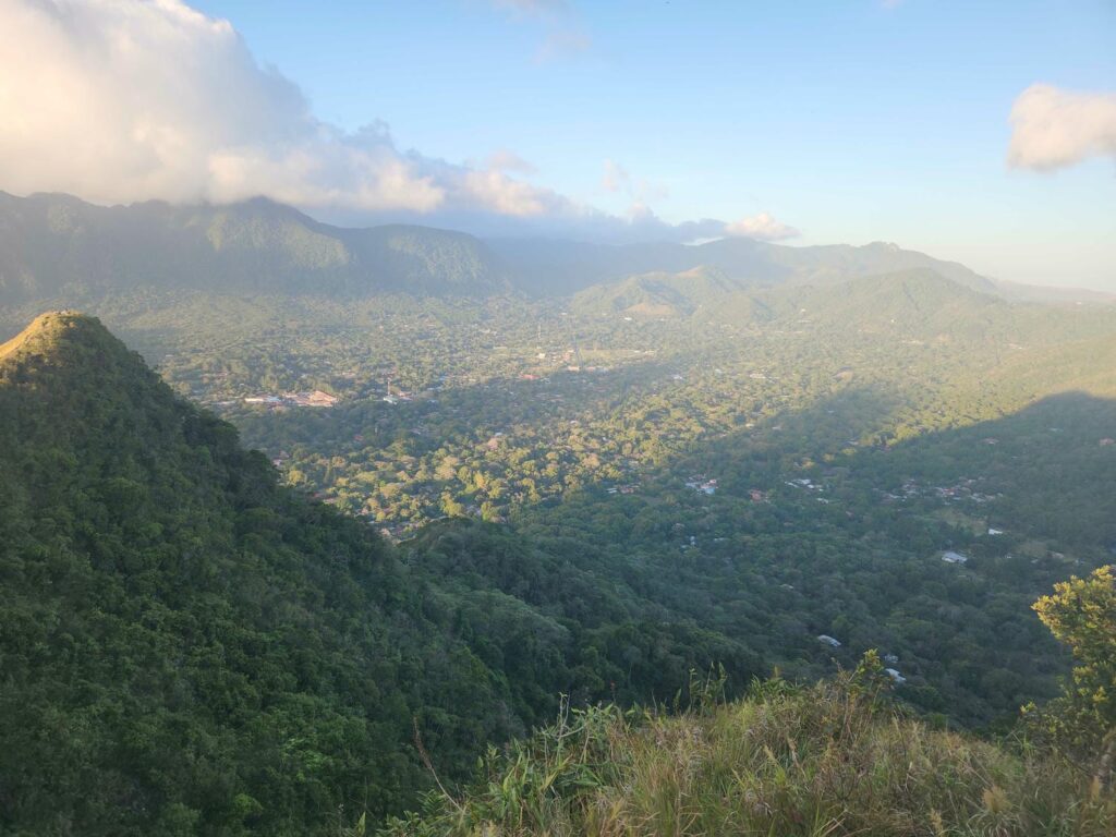 In any case, El Valle is a fascinating town- it is entirely set in the center of a large volcanic caldera. At some point thousands of years ago, the caldera filled with water, which then either overtopped the caldera or caused a landslide down the southwest flank. This means that there is only one “low point” in the ridge encircling the city. It is cool and wet due to its altitude, contrasting with the hot lowlands all around. We camped in a roadside pulloff near a trailhead, in a really cool spot overlooking the city. Before making dinner, we climbed up Cerro Cara Iguana, or “Mount Iguana Face”, for an incredible view of the whole area. From here we could see not only the entire caldera, but also the Pacific Ocean thousands of feet below. We could even see part of the Azuero Peninsula through the haze! It was an amazing view.
