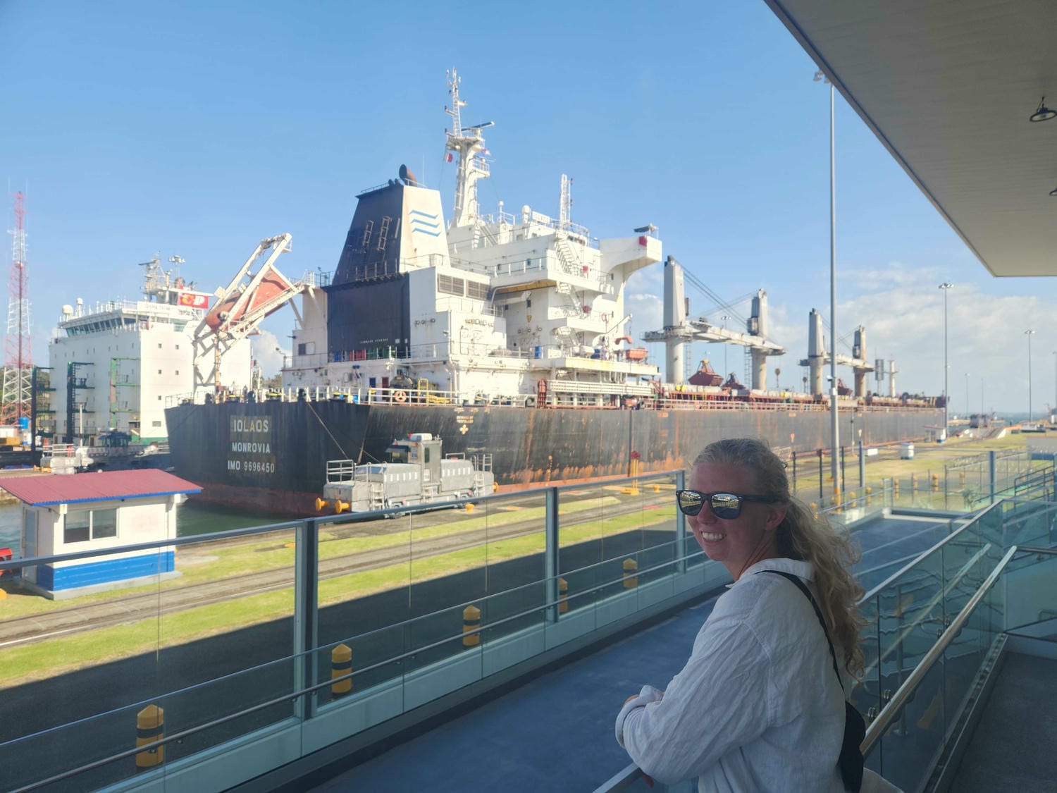 We visited the Agua Clara visitor center first. It is perched on a cliff above the locks, with a commanding view of the Atlantic, Gatun Lake, and the ships passing below. We spent well over an hour just standing at the viewpoint, watching ships go through. We then drove over to the original Gatun locks, which involved crossing the brand-new Atlantic Bridge, the third bridge to cross the Canal, completed in 2019. We really enjoyed our time at the Gatun locks- the viewpoint is pretty much eye-level with the ships, and this time they were going up to the lake, not down to the ocean. It is much more impressive to watch a ship rise than it is to watch it descend! We spent another hour or so here, watching several ships go through. On the Agua Clara side, the ships are guided through the locks by tugboats, but on the Gatun side, there are small locomotives that pull the ships along.