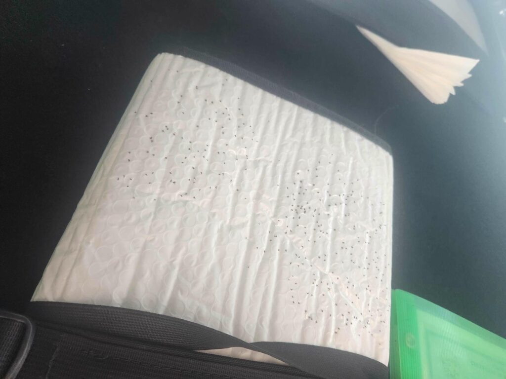 It was blue, calm, and shallow. We were on the shores of a massive lagoon, the Bay of Chetumal. We had a wonderfully relaxing rest of the day, really not doing a whole lot. We were pretty exhausted from our frantic pace the last few days- two major Mayan ruins in three days, with the middle day being a long drive day. We were hoping for a relaxing night as well, but as soon as dusk hit, the bugs were out in force. Even though we moved the jeep a bit in hopes of getting to a less-buggy area, turning on the headlights revealed the problem we’d gotten ourselves into- there were literally thousands of bugs in the air. They were mostly sand flies, which are also known as no-see-ums or chiggers. They are teeny-tiny, small enough to get through our bug mesh, but their teeth aren’t teeny-tiny! They can actually draw blood, despite being smaller than a pinhead. They were even getting through our closed doors, right through the door seals. While putting bug spray on (you shouldn’t need bug spray for sitting INside your car), I noticed that a bunch of the sand flies were landing on the white inner lining of our windshield shade, which we keep tucked up above the driver’s seat. They really seemed to like landing on white surfaces. In a fit of frustration, I sprayed the bugs directly, killing the 10 or 20 that had landed there. A few moments later, I looked up, and noticed that they had continued to land there- but that the bug spray was killing them! By morning, there must have been 200 dead no-see-ums on the windshield shade. Absolutely disgusting.