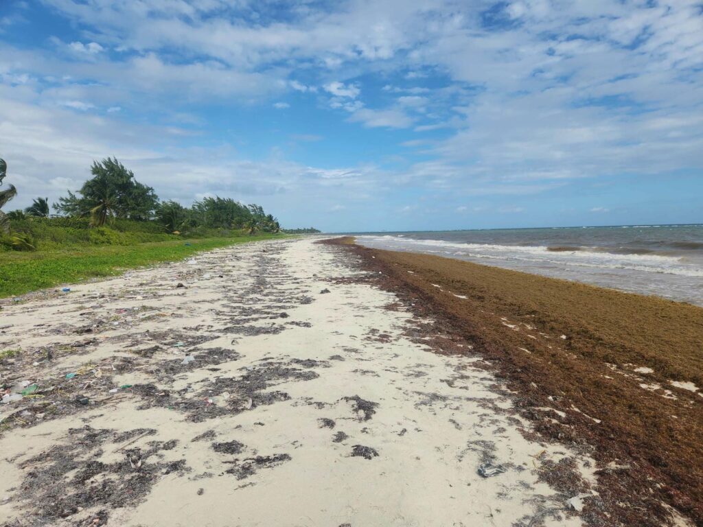 We had a bit of a fitful night’s sleep- even with bug spray, our fans pointed right at us, and a light sheet over us in the muggy heat, we could still feel the tiny bugs biting us and buzzing around. The next morning, we resolved to move spots. We had planned on staying 2 nights in this area, but even without the bugs, the spot wasn’t terribly pleasant. There was no breeze off the lagoon, and the lagoon itself wasn’t terribly inviting to swim in. It was very shallow, and the bottom wasn’t sand- more like mud. The mangrove forest also precluded any exploration around the area. After driving through Xcalak, the tiny beach town on the open ocean side of the peninsula we were on, we eventually found a spot on the coast about 10 miles south of Mahahual. It was much better- a constant breeze off the ocean kept the bugs down! Unfortunately, we still couldn’t go swimming due to the huge amounts of sargassum seaweed that plagues the Caribbean coasts this time of year. There were thick mats of the stuff piled up on the beach, and all the way out past the breaking waves.