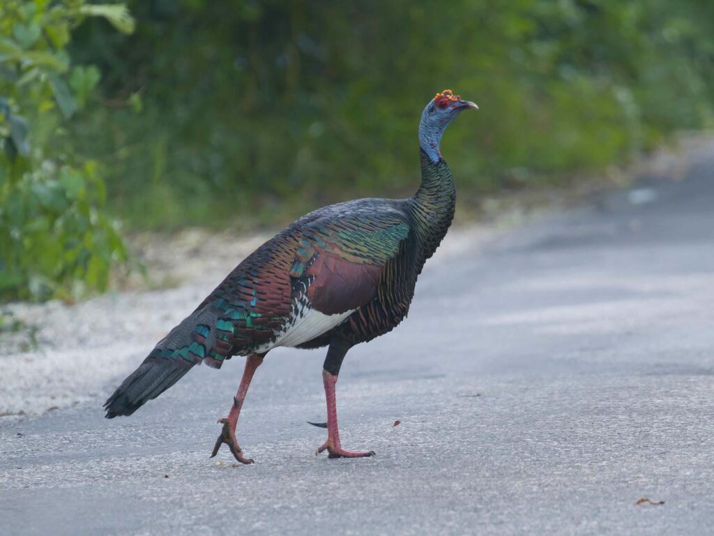 The road to Calakmul is a 2-hour drive from the main highway, and you aren’t allowed past until 6am. There is then another gate which you aren’t allowed past before 7:30am, and then finally into the ruins themselves at 8am. We woke up at 5:30, paid for our tickets, and began driving down the road. It is incredibly unlikely, but there are jaguars in the area, and it is usually the first car (as we were) that sees them! No jaguars unfortunately, but it was a beautiful drive through the jungle. We did see some Ocellated Turkeys, which are shaped a lot like our turkeys, but are colored very differently- blue, green, yellow, and brown! They slipped into the forest very quietly for such a large bird.